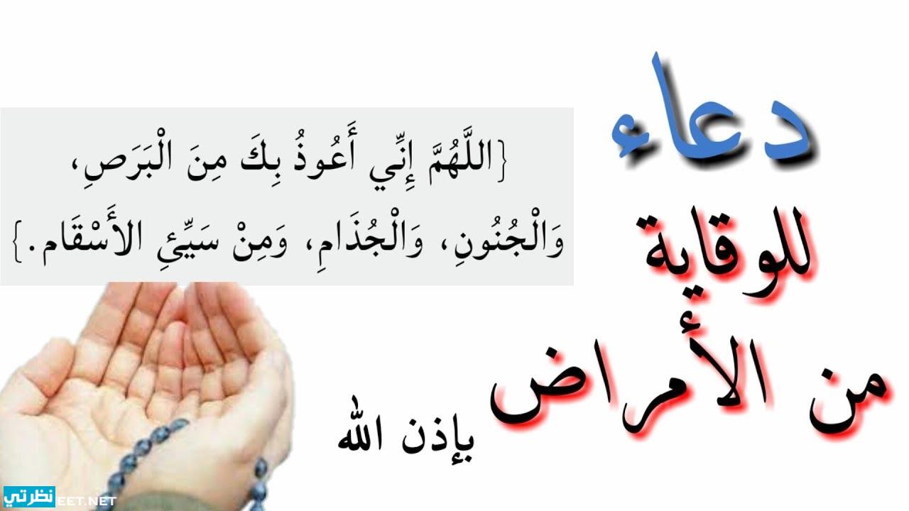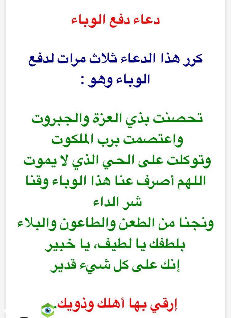 - اللهم عافِني في بدني، اللهمّ عافني في سمعي، اللهم عافني في بصري. اللهم نستودعك انفسنا واهلينا وبلادنا فاحفظنا بحفظك ياحفيظ وانت خير الحافظين. دعاء الاوبئة بسم الله الذي لا يضر مع اسمه شيء في الأرض ولا في السماء وهو السميع العليم(ثلاث مرات). لا إله إلا الله وحده لا شريك له له الملك وله الحمد،