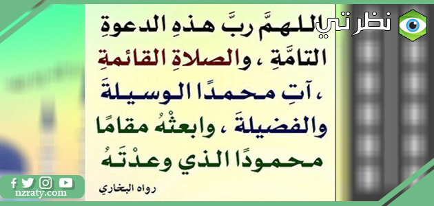 - اللهم رب هذه الدعوة التامة والصلاة القائمة آت محمدا الوسيلة والفضيلة والدرجة الرفيعة العالية وابعثه اللهم المقام المحمود الذي وعدته إنك سبحانك لا تخلف الميعاد.
