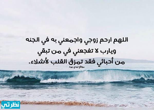 يارب إن قلبي يعتصر في كل حين ويحتضر يارب اجبر قلبي وانت جبار القلوب يارب ارحم حالي وارزقني الصبر والسلوان، يارب إن فاجعة رحيل زوجي أوجعتني، والموت حق، رحل وانت أرحم به منا يا ارحم الراحمين اللهم ارحمه واغفر له واجبرنا يارب فلا إله إلا أنت سبحانك. يارب ارحم زوجي وأجعل أوقاته في جنتك أجمل يا الله اللهم كن أنيسه في وحدته وأرحم غربته و اغفر زلته وأمن روعته يا أرحم الراحمين اللهم ارحمه بقدر ضعفنا أمام غيابه وحزن قلوبنا بفراقه اللهم ارحمه واجمعنا به في جناتك.