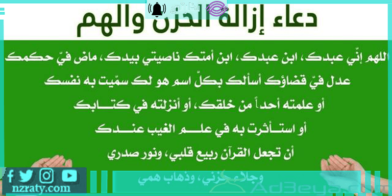 اللهمّ إنّي عبدك، ابن عبدك، ابن أمتك، ناصيتي بيدك، ماضٍ فيّ حكمك، عدلٌ فيّ قضاؤك.. أسألك بكلّ اسمٍ هو لك سمّيت به نفسك، أو أنزلته في كتابك، أو علّمته أحداً من خلقك، أو استأثرت به في علم الغيب عندك.. أن تجعل القرآن العظيم ربيع قلبي، ونور صدري، وجلاء حزني، وذهاب همّي وغمّي.