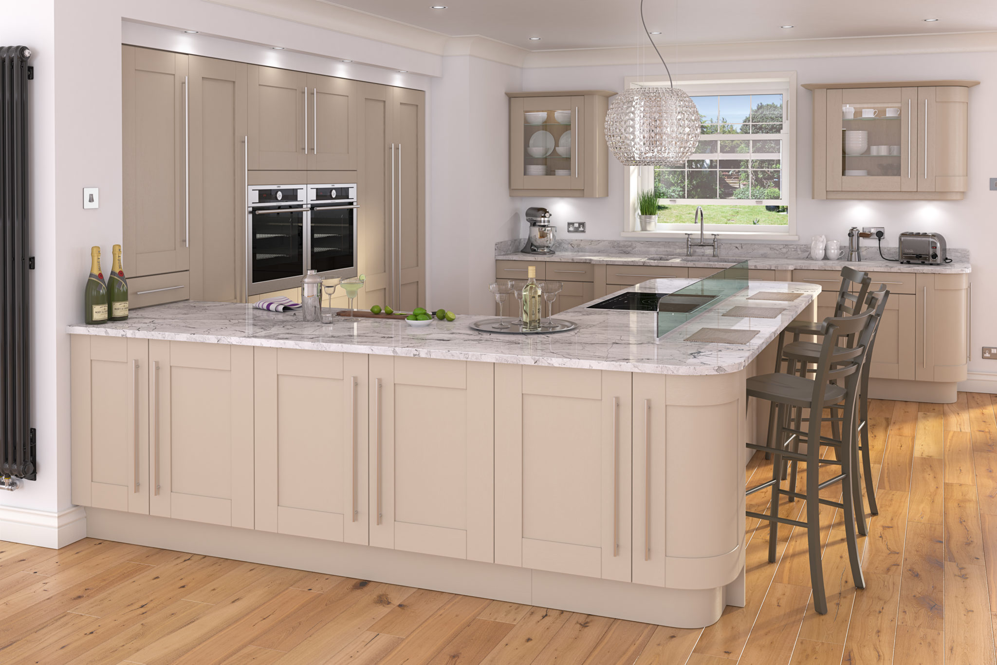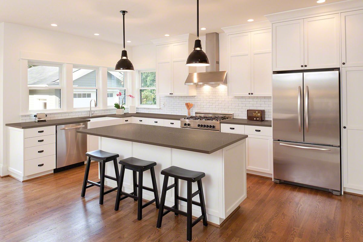 - مطبخ على شكل حرف L: يمكن تقسيم الوحدات والأجهزة المنزلية إلى جدارين حسب رغبتك الشخصية، أما بالنسبة للمساحة الفارغة في المنتصف، فيمكن استغلالها من خلال وضع مائدة للطعام، أو وضع ما يعرف باسم “الجزيرة”، وسميت بذلك لمساحتها المركزية في المطبخ.