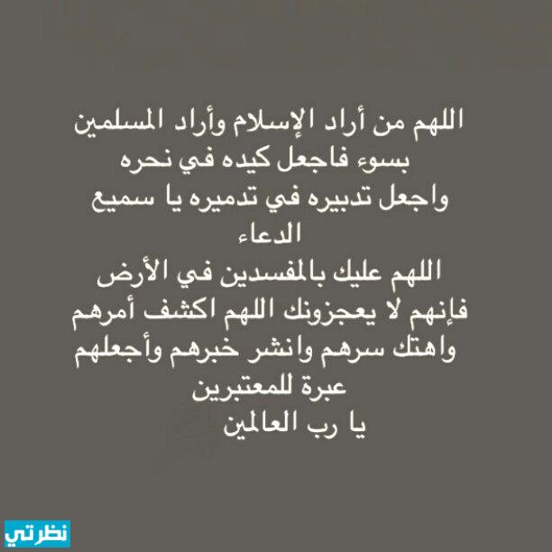 - يارب العالمين إنا نستودعك رجال الوطن ونساءها وأولادها وشبابها وبناتها، اللهم أحفظهم يارب العالمين وجنبهم الأمراض والأوبئة، اللهم أحفظ بلادنا وبلاد المسلمين من شرور العالم ومن شرور مخلوقاتك يارب العالمين وأزل عنا الكرب وأرسل علينا كل ما هو خير. اللهم أحفظ بلادنا من مكر الماكرين، وحسد الحاسدين، وغدر الخائنين، اللهم من أراد ببلادنا سوءًا فاجعل تدميره في تدبيره، ورد كيده في نحره. اللهم من أراد ببلادنا سوء فأشغله بنفسه ورد كيده في نحره، اللهم أحفظ بلادنا وأهلها من كل سوء ومكروه وسائر بلاد المسلمين. اللهم أحفظ بلادنا من كل سوء وأعذها من الفتن ما ظهر منها وما بطن اللهم اجمعنا على الحق، وجنب وطننا الأمراض والأوبئة، اللهم يا مقلب القلوب ثبت قلوبنا على دينك، اللهم إنا نسألك الأمن والأمان، اللهم أدم علينا عزنا وأمننا يارب، اللهم من أراد الإسلام بسوء فاشغله في نفسه.