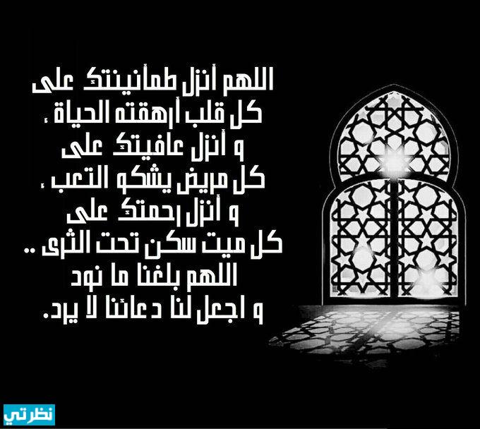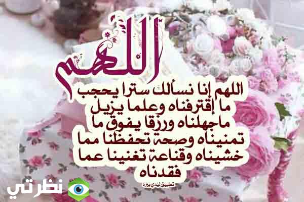اللهم إنا نسألك اللطف فيما قضيت والمعونة على ما أمضيت ونستغفرك من كل قول يعقبه الندم أو فعل تزل به القدم فأنت الثقة لمن توكل عليك والعصمة لمن فوض أمره إليك أسأل الله ان يرفع عنا وعنكم كل شكوى ويلبسنا واياكم لباس الستر والتقوى والعافيه. اللهم انت السلام هادي الأنام جابر الكسر ومفرج الهموم والاحزان أنزل طمأنينتك على كل قلب أرهقته الحياة وأنزل عافيتك على كل مريض يشكو التعب وأنزل رحمتك على من سكنوا الثرى وحقق لناولهم مانتمنى وارزقنا الستر والعافيه والمعافاة الدائمه في ديننا و دنيانا واخرتنا .