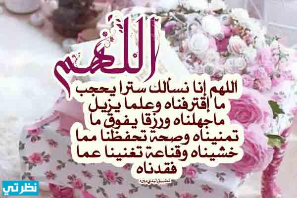 اللهم استرنا بسترك الجميل واجعل تحت الستر ما ترضى به عنا وامنحنا القوة لنواجه ضعفنا، واليقين لتطمئن قلوبنا والبصيرة لتنير طريقنا اللهم إنك ترى ما لانرى وتعلم ما لانعلم فاكفنا شر ما فى الغيب وبدل ذنوبنا إلى حسنات وهمومنا إلى سعادة واحفظنا بحفظك ومن أحبنا فيك ياخير الحافظين. اللهم إنا نسألك سترا يحجب ما إقترفناه وعلما يزيل ماجهلناه ورزقا يفوق ما تمنيناه وصحة تحفظنا مما خشيناه وقناعة تغنينا عما فقدناه اللهم أسترنا فوق الأرض وتحت الأرض ويوم العرض. اللهم إنا نعوذ بك من جهد البلاء ودرك الشقاء وسوء القضاء وشماتة الأعداء. .