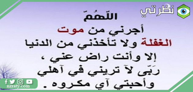 اللهم إني أسألك العافية في الأهل والمال والولد، وأعوذ بك أن يدعو علي رحم قطعتها أو قصرت في حقها، اللهم إني أسألك نفسا بك مطمئنة، تؤمن بلقائك وترضى بقضائك وتقنع بعطائك، اللهم إني أعوذ بك من شر ما يمشي على بطنه، ومن شر ما يمشي على رجلين، ومن شر ما يمشي على أربع، اللهم إني أعوذ بك من ولد يكون علي وبالا، وأعوذ بك من مال يكون علي عذابا، وأعوذ بك من صاحب خديعة إن رأى حسنة دفنها وإن رأى سيئة أفشاها، اللهم اجعل عملنا كله خالصا لوجهك الكريم.
