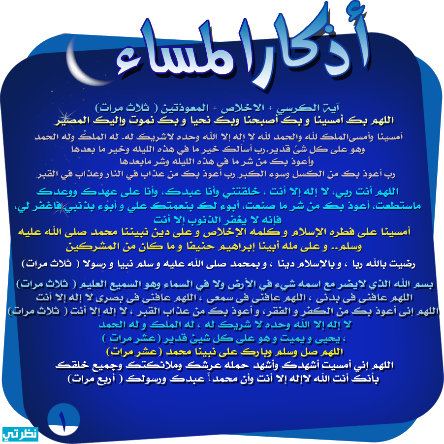 اللهم ما أمسى بي من نعمة أو بأحدٍ من خلقك فمنك وحدك لا شريك لك ،فلك الحمد ولك الشكر، من قال هذا الدّعاء حين يُمسي فقد أدّى إلى الله شكر ليلته.