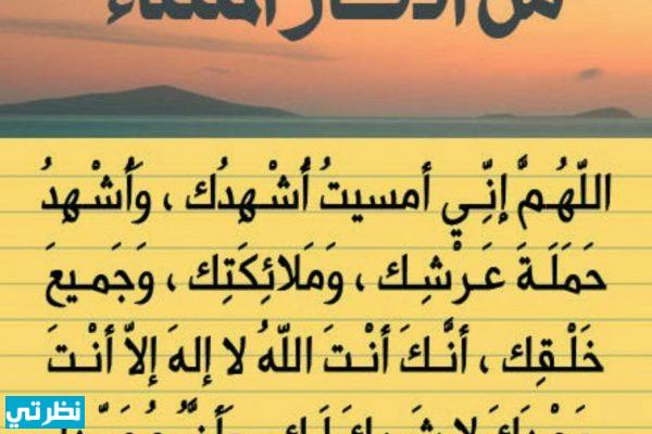 اللهم إنّي أمسيت أُشهدك وأُشهد حملة عرشك و ملائكتك وجميع خلقك أنك أنت الله لا إله إلا أنت وحدك لا شريك لك وأن محمدًا عبدك و رسولك، ويُكرر هذا الدعاء أربع مرّات.