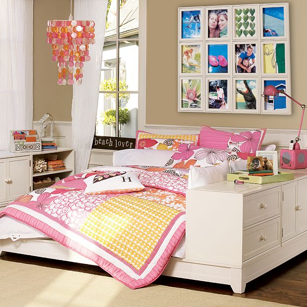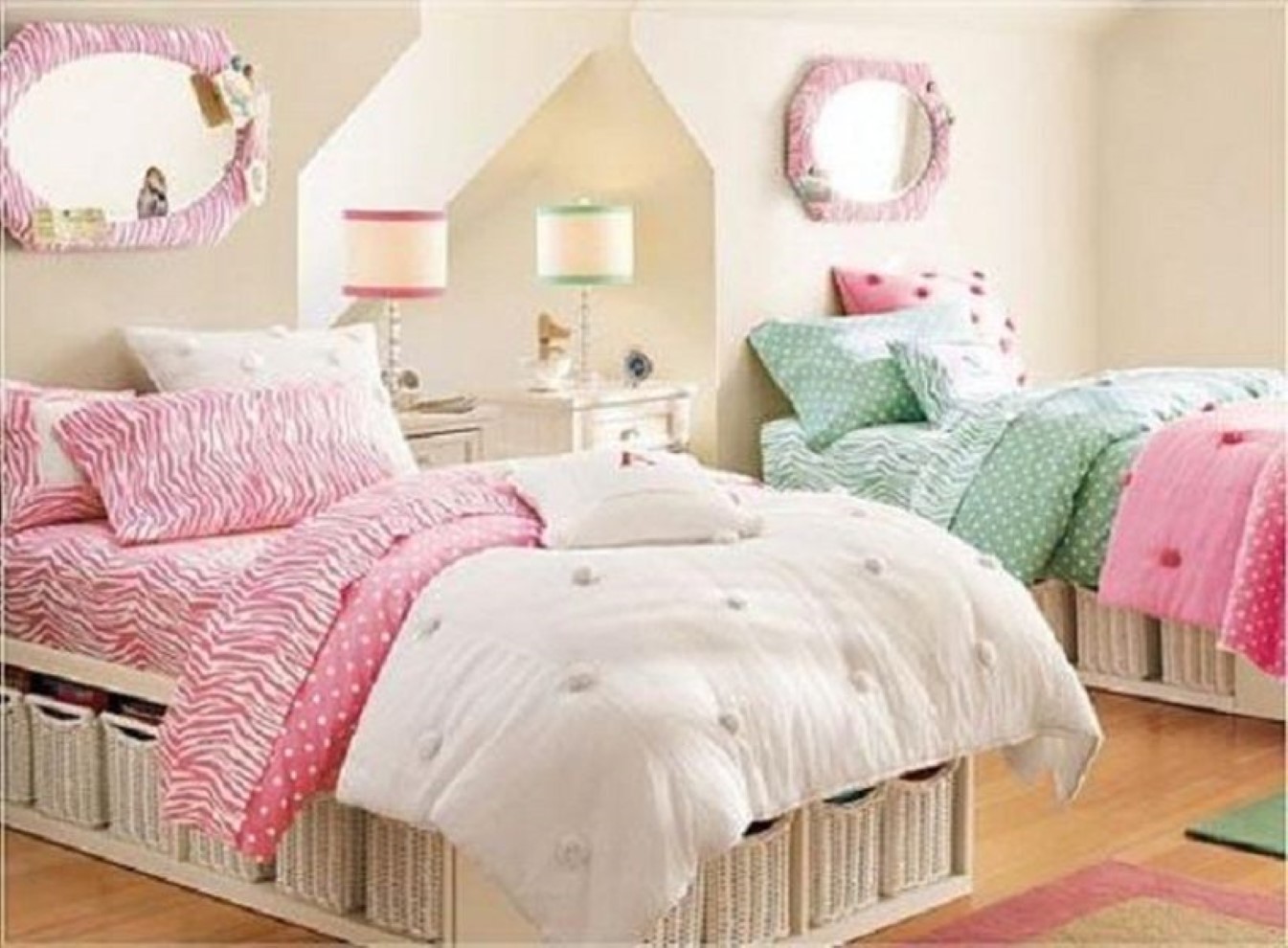- إحدى تصميمات غرف نوم البنات المصممة والمزخرفة من سريرين، يعتمد فيها على تخطيط غرفة النوم المزدوجة، بينما الخزائن المتقاطعة مصممة في الجزء العلوي من السرير لوضع بعض الورق والكتب فيها، ويتم تصميم درج جانبي للمساعدة في الصعود إلى قمة السرير.