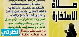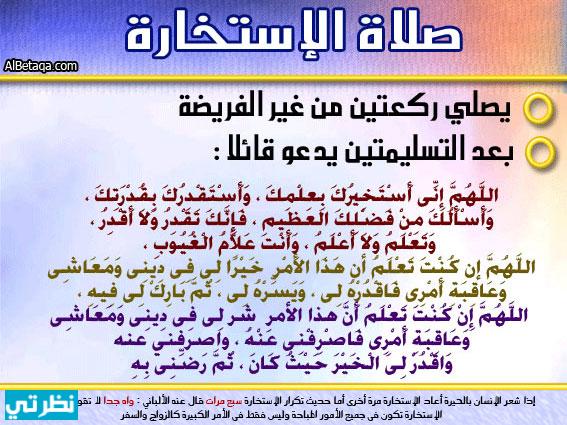 اللّهم أني أستخيرُك بعلمك وأستقدرك بقدرتك وأسألك من فضلك العظيم فإنك تَقْدِرُ ولا أَقَدِْر وتعلَمْ ولا أَعْلَمْ وأنت علاَّمُ الغيوباللّهم إن كنت تعلمُ (ذكر المسألة) خيرٌ لي في ديني ومعاشي وعاقبة أمري فاقْدُرْه لي ويسِّرْه ليوإن كان هذا الأمرُ شراً لي في ديني ومعاشي وعاقبة أمري فاصرفّهُ عني وأصرفني عنه واقْدِرْ لي الخير حيث كان، ثم رَضّتَيِ بهقراءة الفاتحة، والصلاة والسلام على سيّدنا مُحَمّد وعلى آل بيته وأصحابه أجمعين