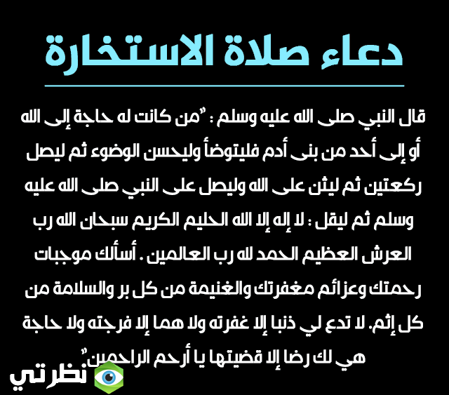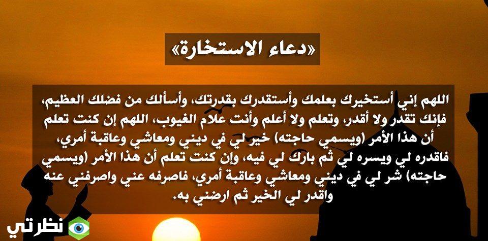 اللَّهُمَّ إنِّي أَسْتَخِيرُكَ بِعِلْمِكَ، وَأَسْتَقْدِرُكَ بِقُدْرَتِكَ، وَأَسْأَلُكَ مِنْ فَضْلِكَ الْعَظِيمِ فَإِنَّكَ تَقْدِرُ وَلا أَقْدِرُ، وَتَعْلَمُ وَلا أَعْلَمُ، وَأَنْتَ عَلامُ الْغُيُوبِ، اللَّهُمَّ إنْ كُنْتَ تَعْلَمُ أَنَّ هَذَا الأَمْرَ (يتم تسمية حاجة الإنسان) خَيْر لِي فِي دِينِي وَمَعَاشِي وَعَاقِبَةِ أَمْرِي أَوْ قَالَ، عَاجِلِ أَمْرِي وَآجِلِه، فَاقدره لِي وَيَسِّرْهُ لِي ثُمَّ بَارِكْ لِي فِيهِ.