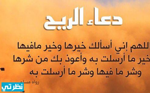 (اللَّهُمَّ إِني أَسْأَلُكَ خَيْرَهَا ، وَخَيْرِ مَا فِيهَا، وخَيْر ما أُرسِلَتْ بِهِوَأَعُوذُ بك مِنْ شَرِّهِا ، وَشَرِّ ما فِيها ، وَشَرِّ ما أُرسِلَت بِهِ).