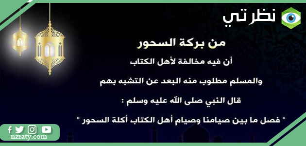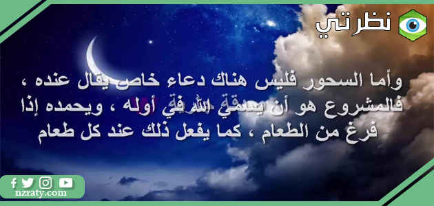 - “إِذَا أَكَلَ أَحَدُكُمْ طَعَاماً فَلْيَقُلْ بِسْمِ اللَّهِ، فَإِنْ نَسِيَ فِي أَوَّلِهِ فَلْيَقُلْ بسمِ اللَّهِ فِي أَوَّلِهِ وَآخِرِهِ مَنْ أَطْعَمَهُ اللَّهُ الطَّعَامَ فَلْيَقُلْ: اللَّهُمَّ بَارِكْ لَنَا فِيهِ وَأَطْعِمْنَا خَيْراً مِنْهُ،وَمَنْ سَقَاهُ اللَّهُ لَبَناً فَلْيَقُلْ اللَّهُمَّ بَارِكْ لَنَا فِيهِ وَزِدْنَا مِنْه”. وعند الانتهاء من تناول السحور، يقول الأدعية التالية: الْحَمْدُ لِلَّهِ الَّذِي أَطْعَمَنِي هَذَا، وَرَزَقَنِيهِ، مِنْ غَيْرِ حَوْلٍ مِنِّي وَلاَ قُوَّةٍ. الْحَمْدُ لِلَّهِ حَمْداً كَثِيراً طَيِّباً مُبَارَكاً فِيهِ، غَيْرَ [مَكْفِيٍّ وَلاَ ] مُوَدَّعٍ، وَلاَ مُسْتَغْنَىً عَنْهُ رَبَّنَا.