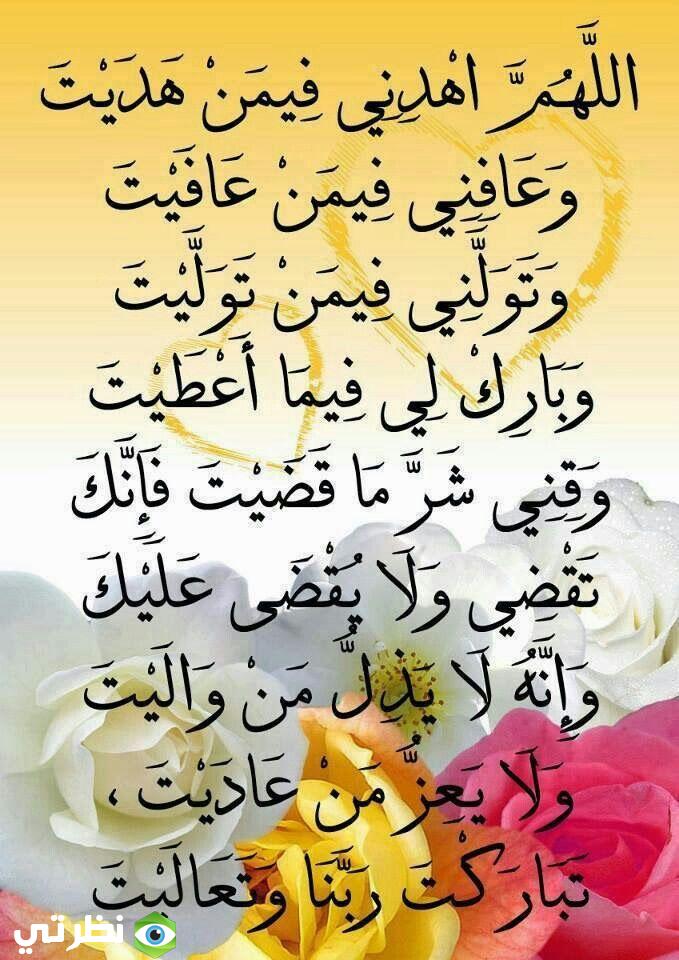 - اللهمَّ اهدِنا فيمَن هدَيتَ وعافِنا فيمَن عافَيتَ وتوَلَّنا فيمَن توَلَّيتَ وبارِكْ لنا فيما أعطَيتَ وقِنا شَرَّ ما قضَيتَ إنَّك تَقضي ولا يُقضى عليكَ إنَّه لا يَذِلُّ مَن والَيتَ تَبارَكتَ ربَّنا وتَعالَيتَ).