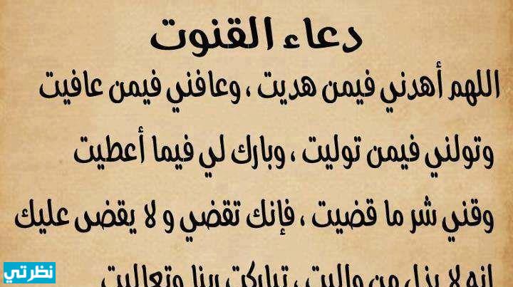 - عن الحسن بن علي -رضي الله عنهما- قَال: عَلَّمَنِي رَسُول اللَّهِ كَلِمَاتٍ أَقُولُهُنَّ فِي الْوِتْرِ: “اللهم اهدنا فيمن هديت، وعافنا فيمن عافيت، وتولنا فيمن توليت، وبارك لنا فيما أعطيت، وقنا واصرف عنا شر ما قضيت، إنك تقضي ولا يقضى عليك، إنه لا يذل من واليت، ولا يعز من عاديت، تباركت ربنا وتعاليت”، وله زيادة: “ولا يَعِزُّ من عاديتَ ، قبلَ تباركتَ وتعاليْتَ” وقيل فيه زيادة: “فَلَكَ الْحَمْدُ عَلَى مَا قَضَيْتَ، أَسْتَغْفِرُكَ وَأَتُوبُ إِلَيْكَ”، ويستحب أن يختم دعاء القنوت بالصلاة على النبيّ.