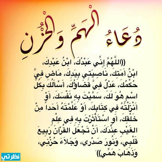 اللهم إنّي عبدك، ابن عبدك، ابن أمتك، ناصيتي بيدك، ماض فيّ حكمك، عدل فيّ قضاؤك، أسألك بكلّ اسم هو لك سمّيت به نفسك، أو علمته أحداً من خلقك، أو أنزلته في كتابك، أو استأثرت به في علم الغيب عندك، أن تجعل القرآن ربيع قلبي، ونور صدري، وجلاء حزني، وذهاب همي، فقد أخبر النّبي – صلّى الله عليه وسلّم – أنّ هذا الدّعاء ما قاله أحد إلا أذهب الله همّه، وأبدله مكان حزنه فرحاً، قالوا:” يا رسول الله ينبغي لنا أن نتعلم هؤلاء الكلمات؟ قال: أجل، يَنْبَغِي لمن سمعهن أن يتعلمهن “، رواه أحمد وغيره، وصحّحه الألباني.