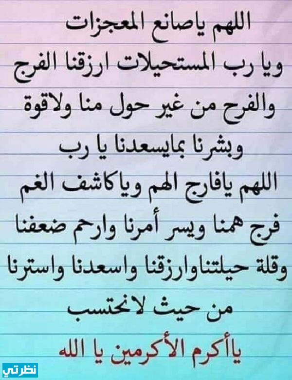 - يا فارج الهمّ ويا كاشف الغم فرج همي ويسر أمري، وارحم ضعفي وقلة حيلتي، وارزقني من حيث لا أحتسب يا رب العالمين.