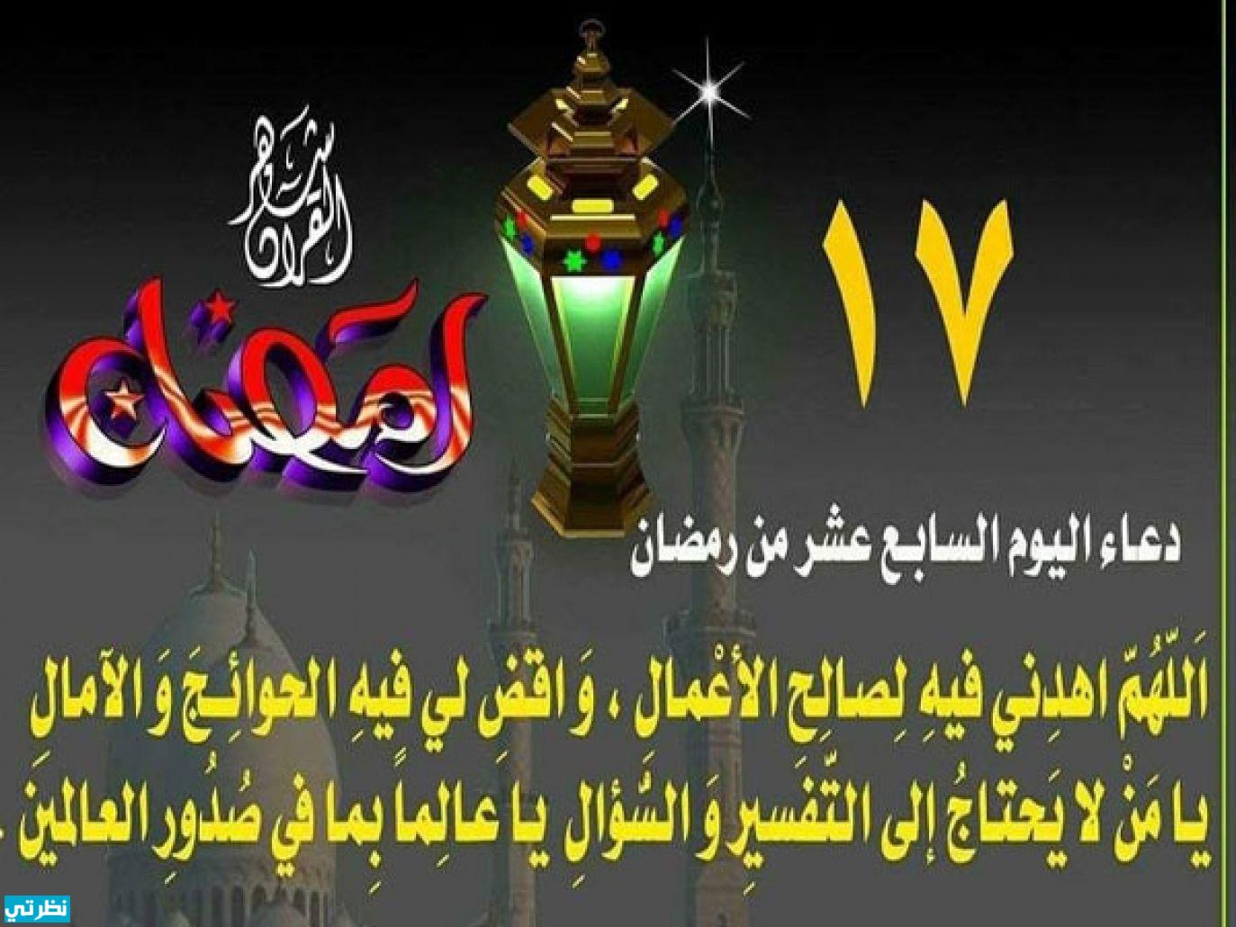 - دعاء اليوم السابع عشر من رمضان اللهم لا تخيبني وأنا أرجوك، ولا تردني وأنا أدعوك، اللهم إن قلبي بين يديك تقلبه كيف تشاء الله ثبتني على طاعتك واجعل شهر رمضان شهر ثبات في الطاعات وفي العمل الصالح.