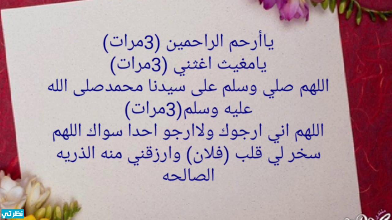 اللهم اني اسألك يا عالم الخفيات ويا من السماء بقدرته مبنية يا من الارض بعزته مدحية ويامن الشمس بنوره مضيئه ويا مقبلا علي كل نفس مؤمنة زكية ويا مسكن الرعب الخائفين واهل التقيه ويا من حوائج الخلق بقدرته مقضية يا من نجيت سيدنا يوسف من رق العبودية ولا يزداد على كثرة الحوائج الا كرما وجودا ان ترزقني الزوج الصالح نعم الزوج والسلوى ونعم الرفيق والمعين علي طاعتك وعبادتك وصلى الله على محمد وآله وأعطني سؤالي انك علي كل شي قدير، اللهم اني أقسم عليك بلا اله الا الله ان ترزقنا وتقضى حاجتنا يالله.