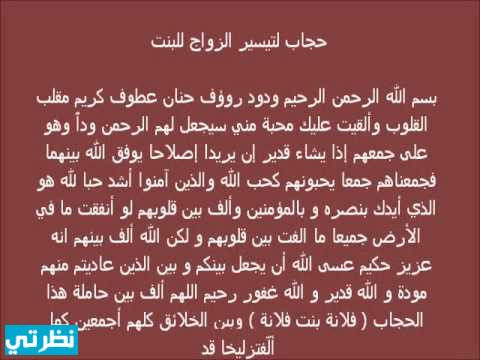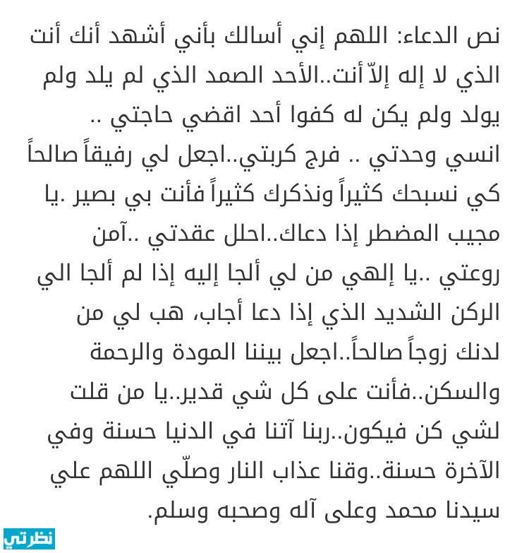 يا مجيب المضطر اذا دعاك..احلل عقدتي ..آمن روعتي..يا الهي من لي الجا اليه اذا لم الجا الي الركن الشديد الذي اذا دعا اجاب ، هب لي من لدنك زوجا صالحا اجعل بيننا المودة والرحمة والسكن. .فانت علي كل شي قدير .يامن قلت لشي كن فيكون، ربنا اتنا في الدنيا حسنة وفي الاخرة حسنة وقنا عذاب النار وصلي اللهم علي سيدنا محمد وعلي اله وصحبه وسلم.