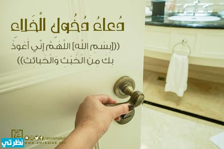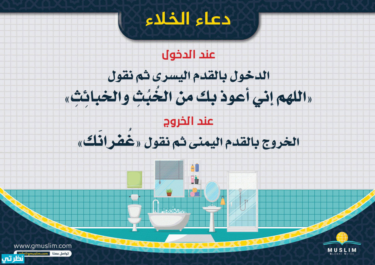 دعاء الخروج من الحمام: ” الحمد لله الذي عرفني لذته وأبقى في جسدي قوته وأخرج عني أذاه يا لها نعمة يا لها نعمة يا لها نعمة لا يقدرها القادرون قدرها “.