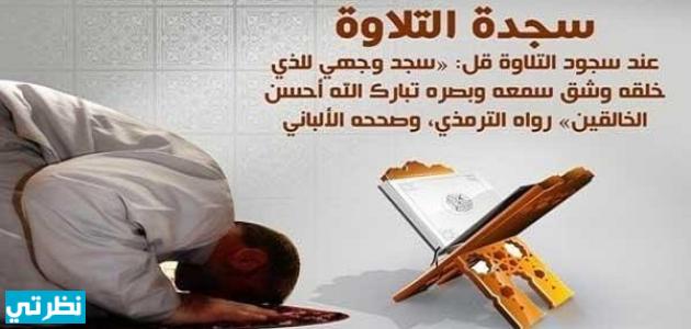 - دعاء سجود التلاوة أو سجدة التلاوة هو: السجود الذي يكون في الصلاة دون السجود خلال الركعة، بل عند قراءة آية فيها سجود في القرآن الكريم وهي: (خمس عشرة آية سجدة)، ويكون سجدة واحدة ثم يعود المصلي إلى حال القيام لإكمال القراءة من الآيات، وإكمال الصلاة إذا كانت الاية التي بها السجود أثناء الصلاة، وله الخيار أيضاً أن يركع دون قراءة، وإذا كانت فقط أثناء تلاوة القرآن فيكون السجود سجدة واحدة فقط.