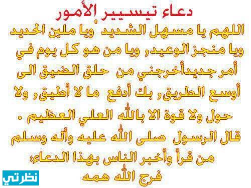 - اللهم يا مسهل الشديد ويا ملين الحديد ويامنجز الوعيد ويامن هو كل يوم في امر جديد اخرجني من حلق المضيق.. الى سعة الطريق بك ادفع مالا اطيق ولا حول ولا قوة الا بالله العلي العظيم. اللهم يا سميع يا بصير يا من هو على كل شيء قدير يا من كان نعم المجيب لنوح لما دعاه يا ذا الجلال اللهم حقق امنياتى وبارك اللهم فيها، يا مسبب الأسباب يا مفتح الأبواب يا مجيب الدعوات يا قابل الحاجات يا سامع الأصوات.