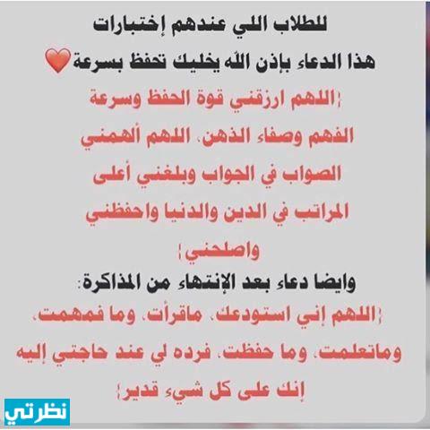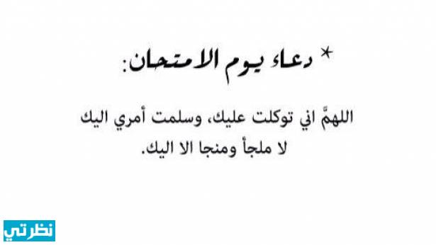 - اللهم ألهمني علماً أعرف به أوامرك واجتنب به نواهيك، وارزقني بلاغة فهم النبيين وفصاحة حفظ المرسلين، وسرعة (اللهم إني توكلت عليك، وفوضت أمري إليك، لا ملجأ ولا منجا منك إلا إليك، لا إله إلا الله الحليم الكريم رب العرش العظيم). (اللهم يا جامع الناس في يوم لا ريب فيه اجمع بيني وبين ضالّتي). (اللهم لا سهل إلا ما جعلته سهلاً فأنت إن شئت جعلت الصعب سهلاً). (اللهم إني أسألك فهم النبيين، وحفظ المرسلين، والملائكة المقربين). (اللهم اجعل ألسنتنا عامرة بذكرك، وقلوبنا بخشيتك، وأسرارنا بطاعتك، يا أرحم الراحمين). (ربي اشرح لي صدري، ويسر لي أمري، واحلل عقدة من لساني يفقهوا قولي). (ربّ ادخلني مدخل صدق وأخرجني مخرج صدق واجعل لي من لدنك سلطاناً نصيراً). (الحمدلله الذي هدانا لهذا وما كنا لنهتدي لولا أن هدانا الله). (اللهم أخرجنا من ظلمات الوهن، وأكرمنا بنور الفهم، وافتح علينا بمعرفة العلم، وحسن أخلاقنا بالحلم، وافتح علينا أبواب جودك وخزائن رحمتك يا أرحم الراحمين).اللهم يسر لي امري وسهل لي حاجتي ووفقني في الاختبار يارب العالمين. اللهم اجعل الصعب سهلاً ووفقي في هذا الامتحان.