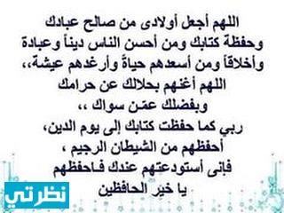اللهم اجعل أبنائي هداة مهتدين غير ضالين ولا مضلين، اللهم جنبهم الفواحش والمحن والزلازل والفتن ما ظهر منها وما بطن، اللهم جنبهم الزنا واللواط والخمر والمخدرات، اللهم سلمهم من العلل والآفات، اللهم سلمهم من شر الأشرار آناء الليل وأطراف النهار واهدهم لما تحبه واغفر لهم يا غفار، اللهم لا تزغ قلوبهم بعد إذ هديتهم وهب لهم من لدنك رحمة وهيئ لهم من أمرهم رشداً.