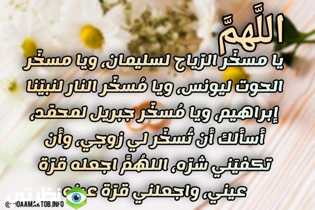 اللهُمَّ اجعل زوجي حبيباً حليماً كريماً هيّناً ليّناً معي، اللهُمَّ اجعله أباً لي في الحنان، وأخاً لي في الطّاعة، وحبيباً في الفراش، واجعلني أمّاً له في الحنان، وأختاً له في الطّاعة، وحبيبةً له في الفراش. اللهُمَّ يا مؤلّف القلوب ألّف بين قلبي وقلب زوجي على محبّتك وطاعتك، اللهُمَّ اجعلني نوراً بين عينَيْ زوجي، اللهُمَّ ارزقني حبّه وارزقه حبّي، وارزقنا حبّ وجهك الكريم وطاعتك، اللهُمَّ اجعلني نوراً بين عينيه،