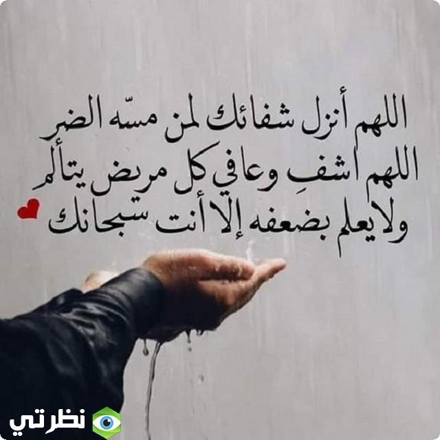 ربّ إنّي مسّني الضرّ وأنت أرحم الرّاحمين.اللهم إنا نسألك بأسمائك الحسنى وبصفاتك العلا وبرحمتك التي وسعت كلّ شيء، أن تمنّ علينا بالشفاء العاجل، وألّا تدع فينا جرحًا إلّا داويته، ولا ألمًا إلا سكنته، ولا مرضًا إلا شفيته، وألبسنا ثوب الصحة والعافية عاجلًا غير آجل، وشافِنا وعافِنا واعف عنا، واشملنا بعطفك ومغفرتك، وتولّنا برحمتك يا أرحم الراحمين.اللهم اشفي مرضنا ومرضي المسلمين جميعاً يارب العالمين.