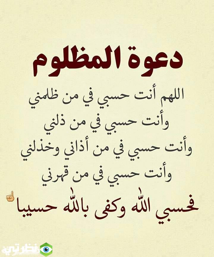 “اللهم يا سامع دعائي على من ظلمني وقهرني، رب أسألك أن تخيب آماله وتشغله في همه وكربه، فاللهم إن هذا الظالم مهما بلغ سلطانه وقوته فإنه لا يمتنع منك، فأنت وحدك مدركه أينما سلك، وأنت وحدك القادر عليه أينما لجأ، فلا ملجأ للمظلوم إلا إليك، ولا توكل للمقهور إلا عليك”. “رباه أنت نصيري ووكيلي، وأنت سامع دعاء على من ظلمني وأبكاني قهراً،.