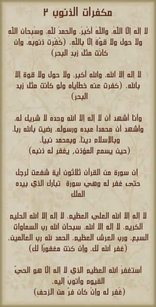 - اللهمّ صلّ وسلّم على سيّدنا محمّد وعلى آله وصحبه الطيّبين الطّاهرين. أستغفر الله العظيم الذي لا إله إلا هو الحي القيوم وأتوب إليه من الذنوب التي تحل النقم، ومن الذنوب التي تغيـر النعم، ومن الذنوب التي تورث الندم، ومن الذنوب التي تحبس القسم، ومن الذنوب التي تعجل الفناء،