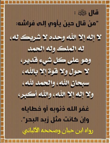 - ورد عن النبيّ -صلى الله عليه وسلم من قاله قبل النوم، غفرت له جميع ذنوبه، فعَن أَبي سَعيدٍ رضي الله عنه عَن النبيّ -صلى الله عليه وسلم- قال: «مَنْ قالَ حِينَ يَأْوِي إِلى فِرَاشِهِ أَسْتَغْفِرُ الله العظيم الّذِي لا إلهَ إلاّ هُوَ الحَيّ القَيّومُ وَأَتُوبُ إِلَيْهِ، ثَلاَثَ مَرّاتٍ، غَفَرَ الله لَهُ ذُنُوبَهُ .