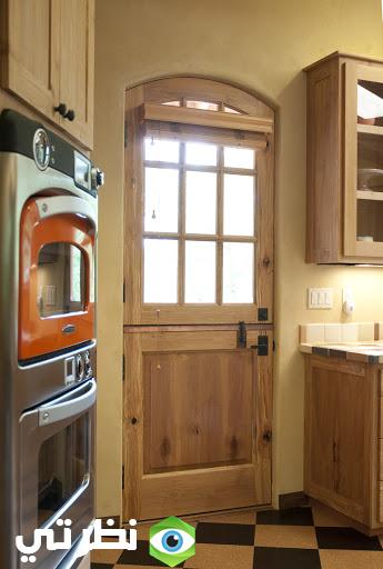 تُعتبر الأبواب الخشبية التي يدخل بها الزجاج من الموديلات الحديثة والتي تواكب العصر وكذلك الأبواب التي تتميز بوجود السحاب أو الجرار مما يسهل حركة الأبواب والدخول والخروج بسهولة والزجاج يعطي منظر بديع وإضاءة للمكان ، وباب المطبخ لا يقل أهمية عن بقية أبواب الغرف الأخرى ، فالمطبخ هو مكان أساسي ورئيسي تقضي فيه المرأة وقتًا طويلًا في تحضير وجبات الفطار والغداء والعشاء فيجب أن يكون الباب له طراز أنيق ويتماشى مع ألوان المطبخ والحوائط والأرضيات ، وفي هذه الصورة نجد تناسق الألوان لباب المطبخ مع الحائط والوان خشب المطبخ وكذلك الأرضية ، وإختيار اللون البيج مع البني الفاتح لون مريح للعين ويعطي هدوء وراحة نفسية.