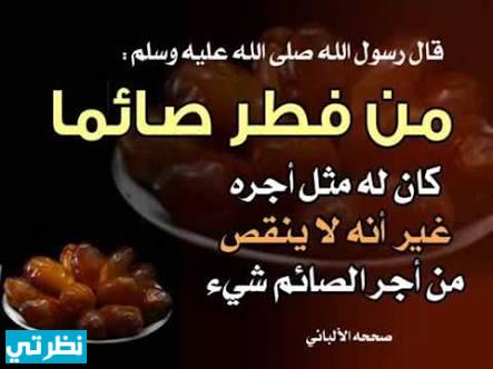 - عن سلمان الفارسي عن النبي صلى الله عليه وسلم قال: «من فطر فيه صائمًا كان مغفرة لذنوبه وعتق رقبته من النار وكان له مثل أجره من غير أن ينقص من أجره شيء» قلنا: “يا رسول الله ليس كلنا يجد ما يفطر الصائم” فقال: «يعطى هذا الثواب من فطر صائمًا على تمرة أو مذقة لبن أو شربة ماء».
