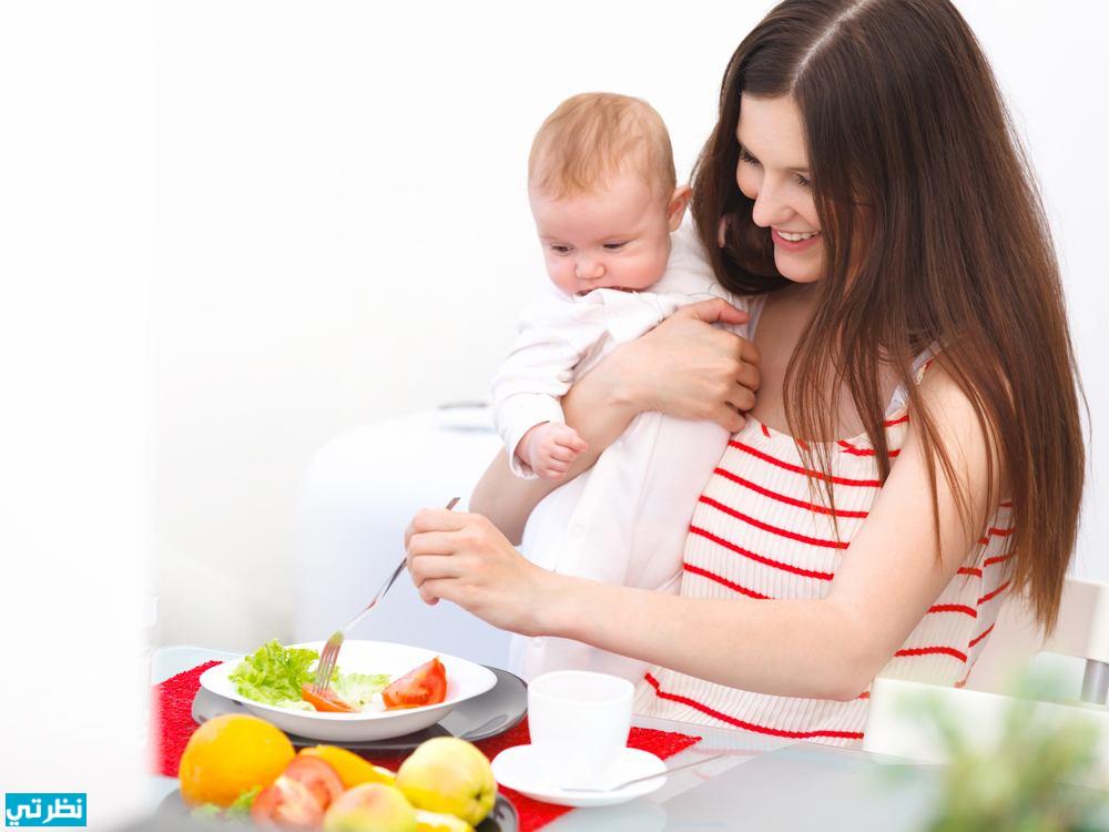 - الأم بحاجة لتناول الغذاء الصحي بعد الولادة، حيث أثبتت الدراسات الحديثة أن الأطفال حديثي الولادة يتأثرون بشدة بالطعام الذي تتناوله الأمهات في تلك المرحلة.